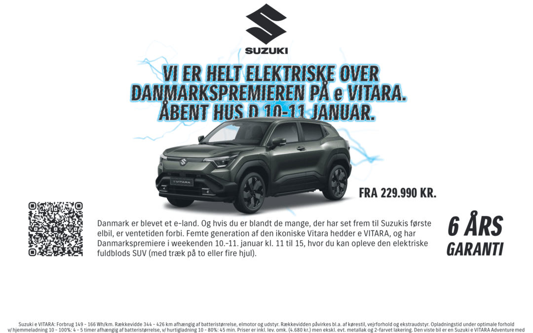Er du én af dem, der har glædet sig – og ventet længe – på den nye Suzuki e VITARA? Så er det dig, vi glæder os til at se d. 10 og 11. januar kl. 11-15.